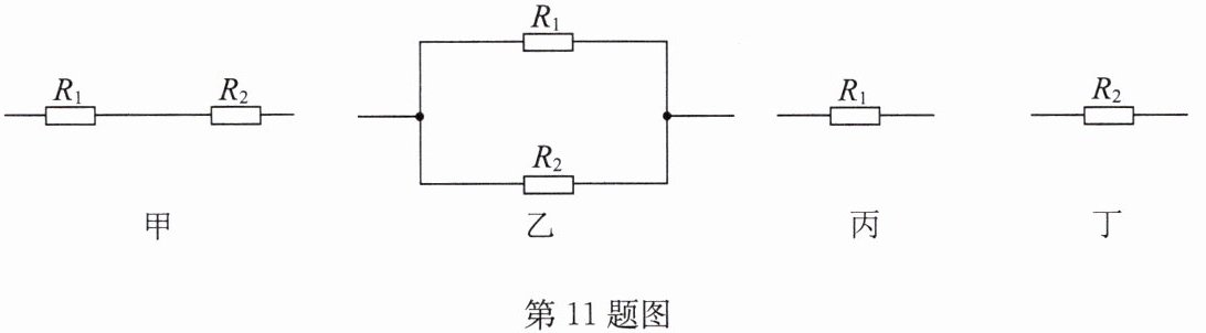 11. 现有两个定值电阻$R_{1}$和$R_{2}(R_{1}>R_{2})$,按照如图所示的四种方式,分别接到电压恒为$U$的电源两端,工作相同的时间.则四个电路中电流做功大小关系正确的是(