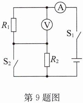 9. 如图所示,电源电压恒定,闭合开关$S_{1}$、$S_{2}$,电压表的示数为$9V$,电流表的示数为$1.5A$;断开开关$S_{2}$,电流表的示数减小了$0.5A$,则此时电压表的示数为
