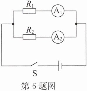 6. 如图所示的电路中,闭合开关 S 后,电流表$ A_{1} $的示数为 0.5A,电流表$ A_{2} $的示数为 0.3A,$ R_{1} $的电功率为 3W. 求: