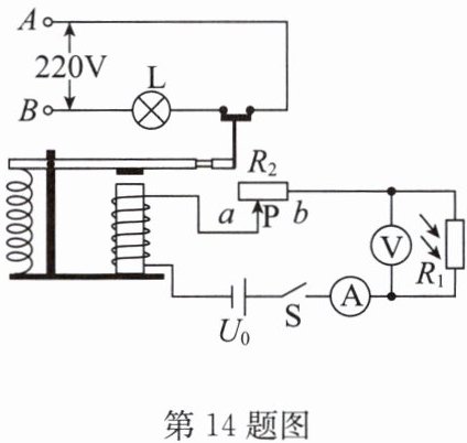 14. 光敏电阻在各种自动化装置中有很多应用,小何用它和电磁继电器等一些电路元件设计了一种“智能家居照明灯”电路。正确连接电路后,电路情况如图所示,B点应接
