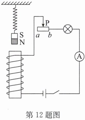 12. 如图所示,在电磁铁的正上方用弹簧悬挂一条形磁体,闭合开关后,将滑动变阻器的滑片P从a端移到b端的过程中,下列判断正确的是(