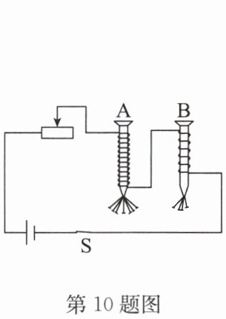 10. 按如图所示电路进行实验,每次总观察到电磁铁A吸引大头针的数目比电磁铁B多。此现象说明影响电磁铁磁性强弱的一个因素是(