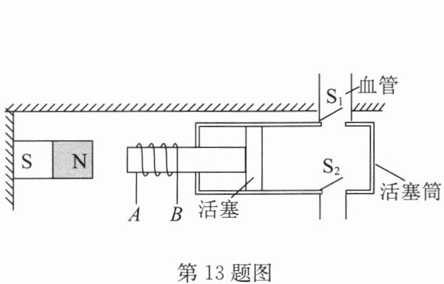 13. 人工心脏泵可短时间代替心脏工作,如图是该装置的示意图,磁体固定在左侧,线圈AB固定在用软铁制成的活塞柄上(相当于一个电磁铁),活塞筒通过阀门与血管相通。阀门S₁只能向外开启,S₂只能向内开启。线圈中的电流从A流向B时,电磁铁的左端是
