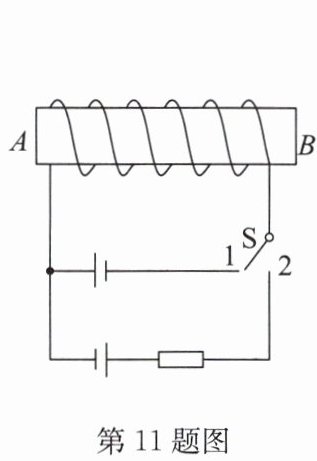 11. 如图所示,两电池的规格相同,当开关S由触点2拨到触点1时,螺线管磁性强弱及其A端磁极极性的变化情况分别为(