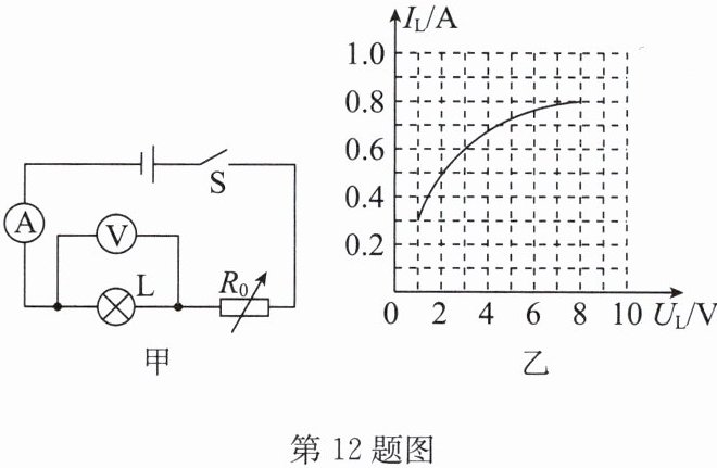 12. (2025·徐州模拟)用如图甲所示电路对一只标有“$0.8A$”字样的小灯泡进行了测试,电源电压恒为$9V$,改变电阻箱$R_{0}$的阻值,根据所测数据作出了灯丝的$I_{L}-U_{L}$图像(如图乙所示).