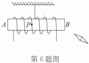 6. 如图,把螺线管沿东西方向水平悬挂起来,然后给导线通电,发现螺线管转动后静止时 A 端指向北方,B 端指向南方,请你在图中将小磁针 N 极涂黑,并标出螺线管中 P 点的电流方向.