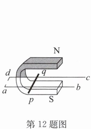 12. (2024·泸州)如图所示,ab、cd两根光滑平行金属导轨固定在同一水平面内,处于蹄形磁体磁场中的金属杆pq放在导轨上,在外力作用下沿导轨运动. 若ad之间断开,则电路中