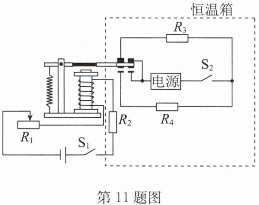 11. 寒冬,为给小鸡仔提供温暖的环境,小明制作了恒温箱系统,原理如图. 控制电路由电磁继电器、滑动变阻器R₁、热敏电阻R₂(安装在恒温箱内,阻值随温度升高而显著减小)、低压电源等组成. 加热电路由电源、电热丝R₃和R₄等组成. 调好R₁的阻值,闭合开关S₁、S₂,箱内温度升高到设定值后即在小范围内波动,且降温阶段降温比较平缓.