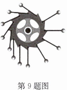 9. 如图是十三世纪法国亨内考设计的“魔轮”,轮子边缘上通过可以自由转动的铰链等距安装了12个相同的活动短杆,杆端分别套上相同的重球.他认为由于右侧重球距离转轴较远,即重力的