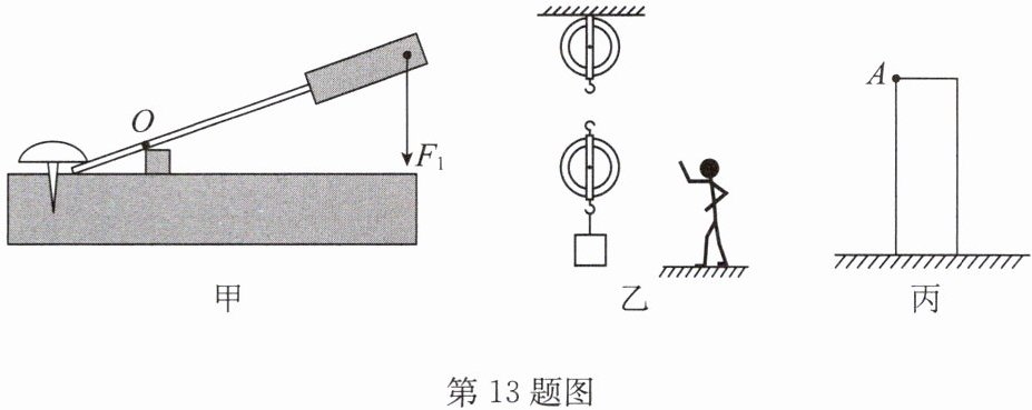 (3)如图丙所示,长方体立放在水平地面上,画出作用在 $ A $ 点,能使它沿顺时针方向倒下的最小推力 $ F $ 的示意图.