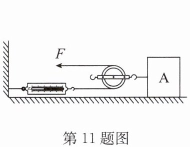 11. (2024·徐州三模)用如图所示的动滑轮拉着物体 A 沿水平方向向左做匀速运动,弹簧测力计的示数为 10N,整个装置的机械效率是 80%,则拉力 $ F $ 的大小为
