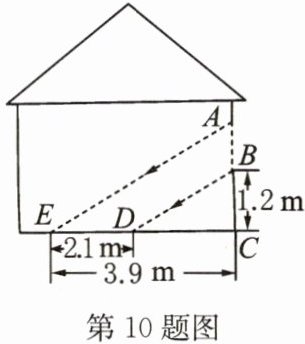 10. 如图,阳光通过窗口AB照到教室内,在地面上留下2.1 m长的光斑DE,已知CE=3.9 m,BC=1.2 m,试求窗口AB的高度.
