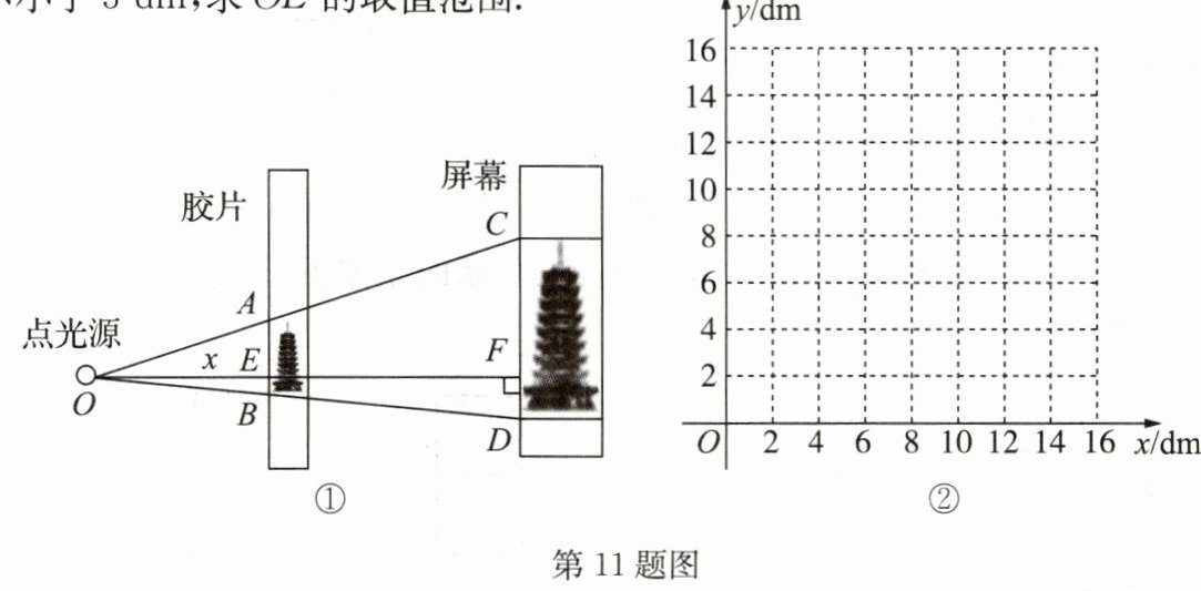11. 如图①,点光源O射出的光线沿直线传播,将胶片上的建筑物图片AB投影到与胶片平行的屏幕上,形成影像CD.已知AB=0.3 dm,胶片与屏幕的距离EF为定值,设点光源到胶片的距离OE的长为x(单位:dm),CD的长为y(单位:dm),当x=6时,y=4.3.