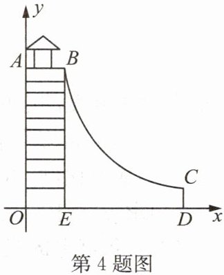 4. 如图为某公园“水上滑梯”的侧面图,其中BC段可看成是双曲线的一段,矩形AOEB为向上攀爬的梯子.OA=5 m,入口AB//OD,且AB=2 m,出口点C距水面的距离CD为1 m,则B,C之间的水平距离DE为(