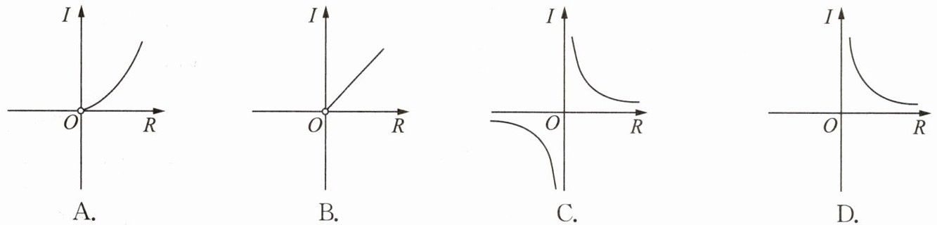 1. 已知蓄电池的电压U为定值,使用蓄电池时,电流I(单位:A)与电阻R(单位:Ω)是反比例函数关系($I=\frac{U}{R}$).下列反映电流I与电阻R之间函数关系的图象大致是(