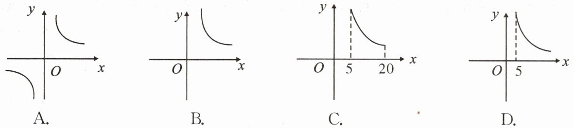 3. 某学校要种植一块面积为100 m²的矩形草坪,要求相邻两边的长均不小于5 m,则草坪一边长y(单位:m)随其邻边长x(单位:m)的变化而变化的图象大致是(