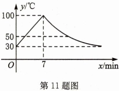 11. 教室里的饮水机接通电源就进入自动程序,开机加热时每分钟上升10℃,加热到100℃停止加热,水温开始下降,此时水温y(单位:℃)与开机后用时x(单位:min)成反比例关系,直至水温降至30℃,饮水机关机.饮水机关机后即刻自动开机,重复上述自动程序.若在水温为30℃时接通电源,水温y与时间x的关系如图所示.