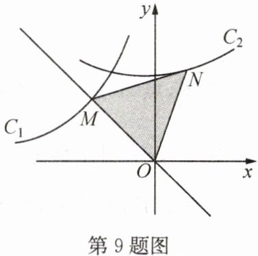 9. 已知反比例函数$C_{1}:y = \frac{k}{x}(k < 0)$的图象如图所示,将该曲线绕点$O$顺时针旋转$45^{\circ}$得到曲线$C_{2}$,点$N$是曲线$C_{2}$上一点,直线$y = -x$与曲线$C_{1}$交于点$M$,连接$MN$,$ON$,若$MN = ON$,$△ MON$的面积为$2\sqrt{3}$,则$k$的值为(