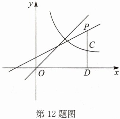12. 如图,过直线$y = kx + \frac{1}{2}$上一点$P$作$PD ⊥ x$轴于点$D$,线段$PD$交函数$y = \frac{m}{x}(x > 0)$的图象于点$C$,点$C$为线段$PD$的中点,点$C$关于直线$y = x$的对称点$C'$的坐标为$(1,3)$。