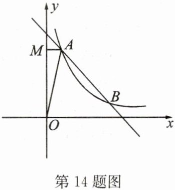14. 如图,一次函数$y = mx + 5$的图象与反比例函数$y = \frac{k}{x}(k ≠ 0)$在第一象限的图象交于$A(1,n)$,$B(4,1)$两点,过点$A$作$y$轴的垂线,垂足为$M$。