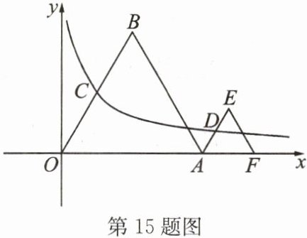 15. 如图,等边$△ OAB$和等边$△ AFE$的一边都在$x$轴上,双曲线$y = \frac{k}{x}(x > 0)$经过$OB$的中点$C$和$AE$的中点$D$,且等边$△ OAB$的边长为$4$。