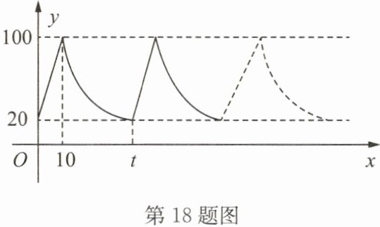 18. 小丽家饮水机中原有水的温度为$20^{\circ}C$,通电开机后,饮水机自动开始加热,此过程中水温$y$(单位:$^{\circ}C$)与开机时间$x$(单位:分)满足一次函数关系。当水温达到$100^{\circ}C$时,饮水机自动停止加热,随后水温开始下降,此过程中水温$y$与开机时间$x$成反比例关系。当水温降至$20^{\circ}C$时,饮水机又自动开始加热,重复上述程序(如图所示)。根据图中提供的信息,解答问题: