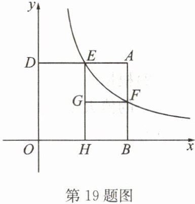 19. 如图,矩形$ABOD$的两边$OB$,$OD$都在坐标轴的正半轴上,$OD = 3$,另两边与反比例函数$y = \frac{k}{x}(k ≠ 0)$的图象分别相交于点$E$,$F$,且$DE = 2$。过点$E$作$EH ⊥ x$轴于点$H$,过点$F$作$FG ⊥ EH$于点$G$。