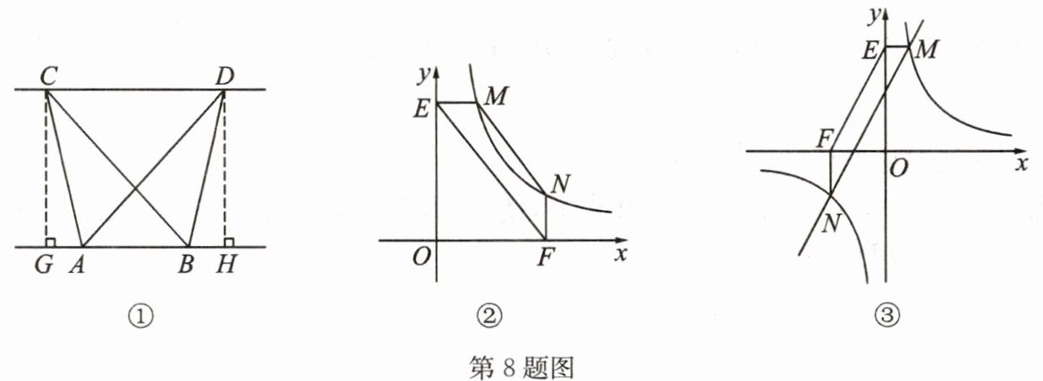 (1)如图②,点 M,N 在反比例函数 $ y = \frac{k}{x}(x > 0) $ 的图象上,过点 M 作 ME⊥y 轴,过点 N 作 NF⊥x 轴,垂足分别为 E,F,求证:MN//EF;