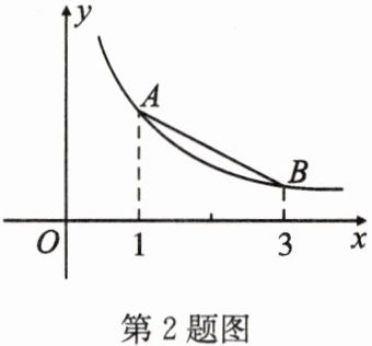 2. 如图,反比例函数 $ y = \dfrac{k}{x}(x > 0) $ 图象上的两点 $ A $,$ B $ 的横坐标分别为 $ 1 $,$ 3 $,点 $ P $ 为 $ x $ 轴正半轴上一点。若 $ PA - PB $ 的最大值为 $ 2\sqrt{2} $,求 $ k $ 的值。