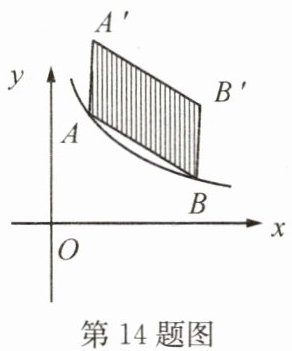 14. 如图,点 $ A(m,2) $,$ B(5,n) $ 在双曲线 $ y = \dfrac{k}{x} (k > 0,x > 0) $ 上,将线段 $ AB $ 向上平移 $ 2 $ 个单位长度,点 $ A $,$ B $ 的对应点分别为点 $ A' $,$ B' $。若图中阴影部分的面积为 $ 6 $,则 $ k = $