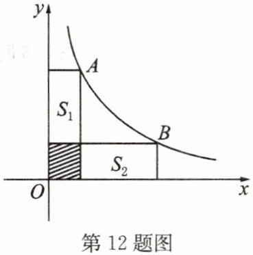 12. 如图,点 $ A $,$ B $ 是双曲线 $ y = \dfrac{3}{x} $ 上的点,分别经过 $ A $,$ B $ 两点向 $ x $ 轴、$ y $ 轴作垂线段,若 $ S_{\mathrm{阴影}} = 1 $,则 $ S_1 + S_2 = $