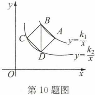 10. 如图,正方形 $ ABCD $ 的顶点分别在反比例函数 $ y = \dfrac{k_1}{x} (k_1 > 0) $ 和 $ y = \dfrac{k_2}{x} (k_2 > 0) $ 的图象上。若 $ BD // y $ 轴,点 $ D $ 的横坐标为 $ 3 $,则 $ k_1 + k_2 $ 的值是(