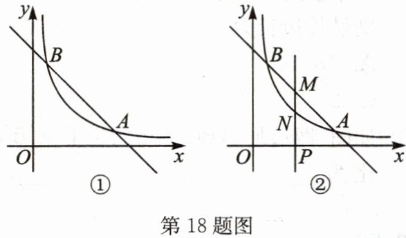 18. 如图①,在平面直角坐标系 $ xOy $ 中,一次函数 $ y = kx + 6 $ 与反比例函数 $ y = \dfrac{5}{x} (x > 0) $ 的图象的两个交点分别为 $ A(a,1) $,$ B $。