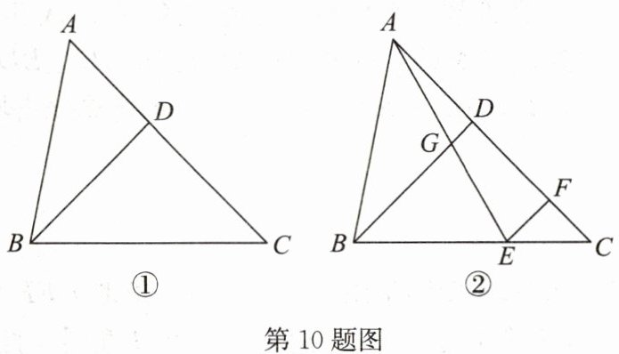 10. 如图①,在$△ ABC$中,$BD$平分$∠ ABC$,$BD = CD$,$AB = 4$,$AC = 6$.