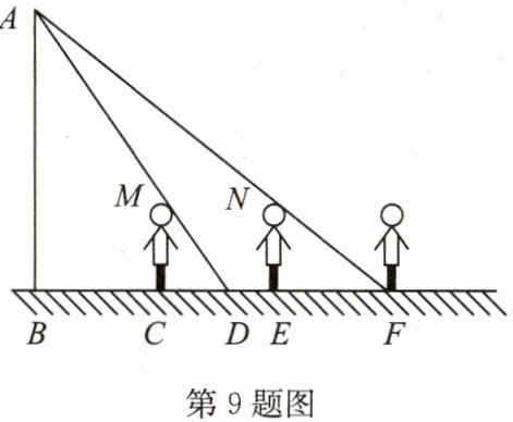 9. 如图,王华晚上由路灯 $A$ 下的 $B$ 处走到 $C$ 处时,测得影子 $CD$ 的长为 $1$ 米,继续往前走 $3$ 米到达 $E$ 处时,测得影子 $EF$ 的长为 $2$ 米,已知王华的身高是 $1.5$ 米。
