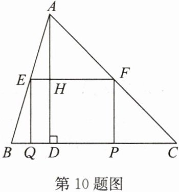 10. 如图,在 $△ ABC$ 中,$∠ C = 45^{\circ}$,$BC = 10$,高 $AD = 8$,矩形 $EFPQ$ 的一边 $QP$ 在 $BC$ 边上,$E$,$F$ 两点分别在 $AB$,$AC$ 上,$AD$ 交 $EF$ 于点 $H$。