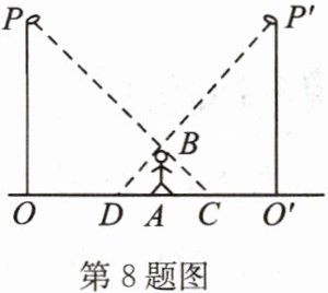 8. 如图,李华晚上在路灯下散步。已知李华的身高 $AB = h$,灯柱的高 $OP = O'P' = l$,两灯柱之间的距离 $OO' = m$。