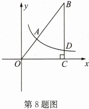 8. 如图,双曲线$ y=\frac{k}{x}$经过 Rt△BOC 斜边上的一点 A,且满足 AO:AB=2:3,与 BC 交于点 D,若$ S_{△BOD}=21$,则 k=(