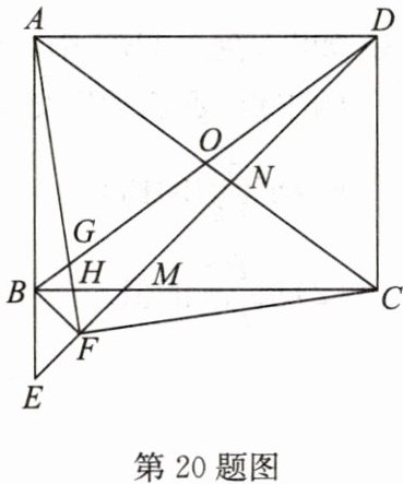20. 如图,在矩形 ABCD 中,对角线 AC,BD 交于点 O,∠ADC 的平分线 DE 分别交 AC,BC 于点 N,M,交 AB 的延长线于点 E,F 为 EM 的中点,连接 AF,BF,CF,线段 AF 分别交 BD,BC 于点 G,H.