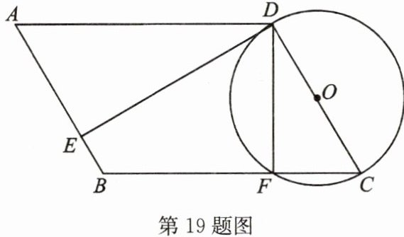19. 如图,四边形 ABCD 为平行四边形,以 CD 为直径作⊙O,⊙O 与边 BC 相交于点 F,⊙O 的切线 DE 与边 AB 相交于点 E,且 AE=3EB.