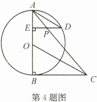 4. 如图,$AB$是$\odot O$的直径,$BC$切$\odot O$于点$B$,$OC//$弦$AD$,过点$D$作$DE⊥ AB$于点$E$,连$AC$交$DE$于点$P$.