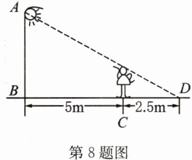 8. 如图,身高$1.6m$的小华站在距路灯杆$5m$的$C$点处,测得她在灯光下的影长$CD$为$2.5m$,则路灯的高度$AB$为(
