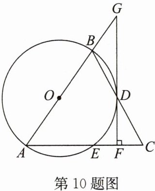 10. 如图,在等腰三角形 $ ABC $ 中,$ AB = AC $,以 $ AB $ 为直径的 $ \odot O $ 交 $ BC $ 于点 $ D $,交 $ AC $ 于点 $ E $,过点 $ D $ 作 $ DF ⊥ AC $ 于点 $ F $,交 $ AB $ 的延长线于点 $ G $.