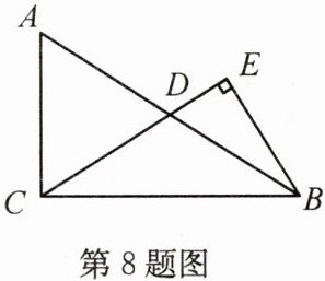 8. 如图,在 $ \mathrm{Rt} △ ABC $ 中,$ ∠ ACB = 90^{\circ} $,$ D $ 为 $ AB $ 的中点,$ BE ⊥ CD $ 于 $ E $,若 $ AC = 15 $,$ \cos A = \dfrac{3}{5} $.