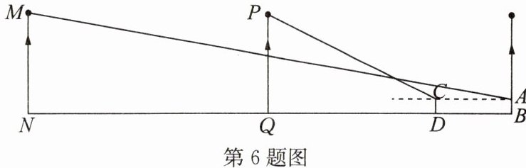 6. 在一次测量物体高度的数学实践活动中,张老师从一条笔直的公路上选择三盏高度相同的路灯进行测量. 如图,他先在路灯B处利用测倾器测得路灯MN顶端的仰角为10°,再沿BN的方向前进10米,到达点D处,在点D处利用同一个测倾器测得路灯PQ顶端的仰角为27°. 若测倾器的高度为1.2米(AB=CD=1.2米),相邻两根灯柱之间的距离相等,求路灯的高度(结果精确到0.1米).(参考数据:sin10°≈0.17,cos10°≈0.98,tan10°≈0.18,sin27°≈0.45,cos27°≈0.89,tan27°≈0.51)