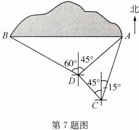 7. 小明学了《解直角三角形》内容后,对一条东西走向的隧道AB进行实地测量. 如图所示,他在地面上点C处测得隧道一端点A在他的北偏东15°方向上,他沿西北方向前进$100\sqrt{3}$m后到达点D,此时测得点A在他的东北方向上,端点B在他的北偏西60°方向上.(点A,B,C,D在同一平面内)