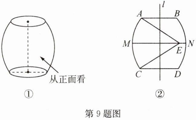 9. 如图①是一张圆凳的造型,已知这张圆凳的上、下底面圆的直径都是30 cm,高为42.9 cm. 它被平行于上、下底面的平面所截,截得的横截面都是圆. 小明画出了它的主视图,是由上、下底面圆的直径AB,CD以及$\overset{\frown}{AC}$,$\overset{\frown}{BD}$组成的轴对称图形,直线l为对称轴,点M,N分别是$\overset{\frown}{AC}$,$\overset{\frown}{BD}$的中点,如图②,他又画出了$\overset{\frown}{AC}$所在扇形的圆心角∠AEC,并度量出∠AEC=66°,他发现并证明了点E在MN上. 请你计算MN的长.
