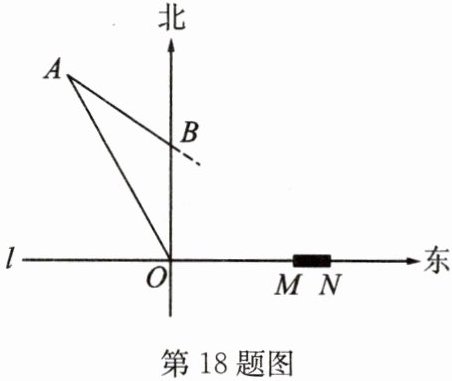 18. 如图,在东西方向的海岸线 $ l $ 上有一长为 $ 1 \, \mathrm{km} $ 的码头 $ MN $,在码头西端 $ M $ 的正西方向 $ 30 \, \mathrm{km} $ 处有一观察站 $ O $.某时刻测得一艘匀速直线航行的轮船位于 $ O $ 的北偏西 $ 30^{\circ} $ 方向,且在与 $ O $ 相距 $ 20\sqrt{3} \, \mathrm{km} $ 的 $ A $ 处;经过 $ 40 $ 分钟,又测得该轮船位于 $ O $ 的正北方向,且在与 $ O $ 相距 $ 20 \, \mathrm{km} $ 的 $ B $ 处.