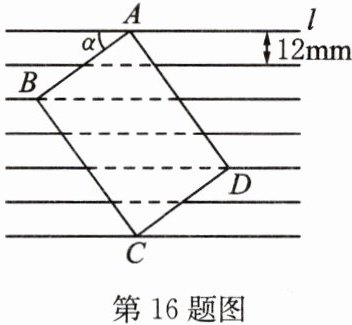 16. 如图,把一张长方形卡片 $ ABCD $ 放在每格宽度为 $ 12 \, \mathrm{mm} $ 的横格纸中,恰好四个顶点都在横格线上,已知 $ α = 36^{\circ} $,求长方形卡片的周长.(精确到 $ 1 \, \mathrm{mm} $,参考数据:$ \sin 36^{\circ} \approx 0.60 $,$ \cos 36^{\circ} \approx 0.80 $,$ \tan 36^{\circ} \approx 0.75 $)