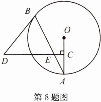 8. 如图,$ AB $ 是 $ \odot O $ 的弦,点 $ C $ 为半径 $ OA $ 的中点,过点 $ C $ 作 $ CD ⊥ OA $ 交弦 $ AB $ 于点 $ E $,连 $ BD $,若 $ DE = DB $.
